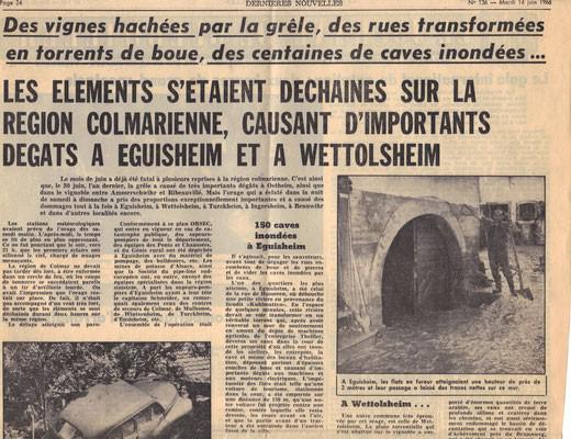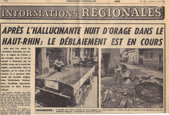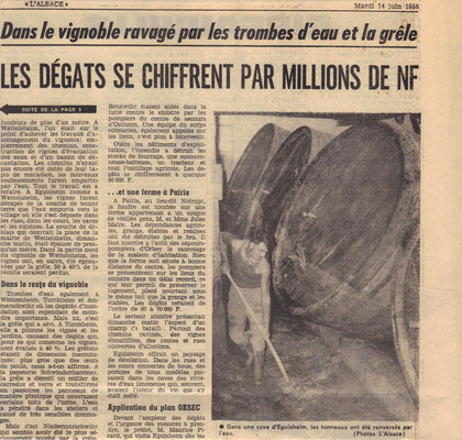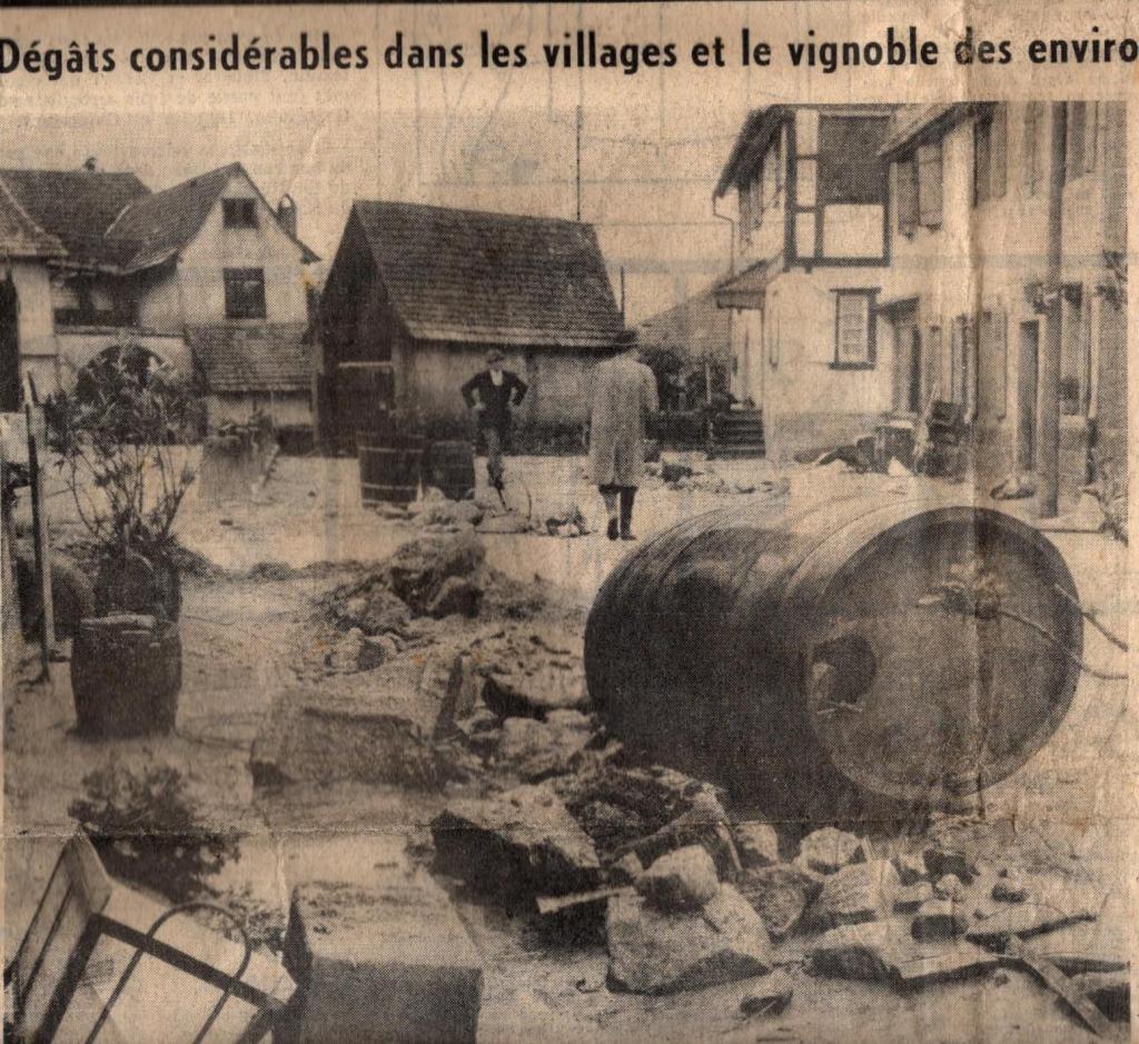 L’orage du dimanche matin 12 Juin 1966 vers 1 heure fut comparable à celui du 14 Juillet 1866, 100 ans auparavant ! L’eau descendait par la rue de la Porte Haute et le fossé de la Kirchmatt en formant deux torrents boueux amenant de grosses pierres depuis le Bechtal et emportant tout sur son passage vers le village. Quelques 150 caves furent inondées. Au lever du soleil, on trouvait des rues impraticables, jonchées de pierrailles, de gros galets et de pièces hétéroclites provenant des cours et des hangars écurés. Dans le vignoble, à l’ouest du village certaines parcelles présentaient une image de dévastation. Des murailles centenaires avaient été démolies par la vague tumultueuse semblable à celle provenant d’un barrage ayant brusquement cédé. Le grondement de ces masses d’eau roulant des galets à travers le village reste dans la mémoire de ceux qui l’ont entendu. On a trouvé des cuves et des tonneaux jusqu’à la tuilerie Sturm. Les tonneaux vides dans les caves poussaient dangereusement les solives du plafond soulevant le plancher en bois du rez-de-chaussée. Les moteurs des voitures inondées ne pouvaient plus tourner. Des portes furent enfoncées, les plus contreventées résistèrent. Dans la partie haute du village, l’eau atteignit un niveau de 1,50 m bien visible le matin par l’empreinte limoneuse laissée sur les façades et portes. Des voitures garées dans des cours furent entraînées par les flots après que la porte eut cédé. Ce fut une vision d’apocalypse. Les dégâts sont estimés par les journaux à 10 millions de Francs.
