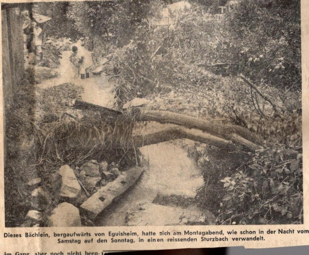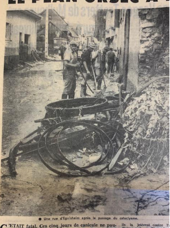 Cela faisait 6 mois que j’étais à Eguisheim. Notre voisin Gérard Rubet qui venait d’acheter la maison Keck et son épouse Laurette m’ont demandé si cela arrivait souvent ? Impossible de traverser le courant était si fort. La dernière catastrophe avait eu lieu en 1866 ! Cela nous rassurait un peu !