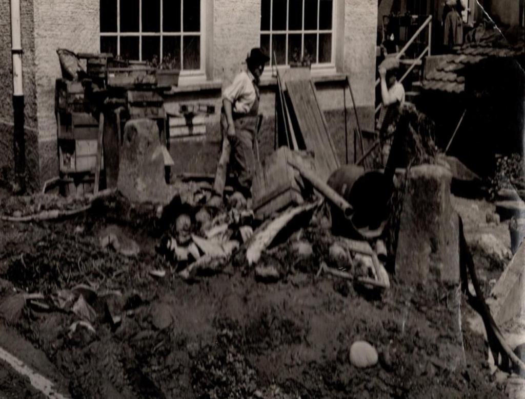 Dégâts de submersion de boue dans les jardins du Bachoefelé (rue des Fleurs). C’est par là que les eaux boueuses trouvent leur chemin de sortie du village avant de se déverser dans le fossé du Malsbach à hauteur du cimetière. Il n’y avait là à l’époque que prés et jardins.