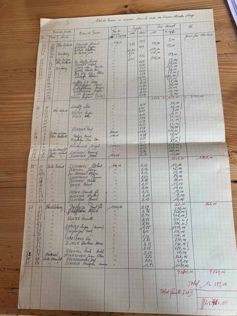 Chez Freudenreich Joseph, les pertes sont astronomiques. 750 Kg de pommes de terres, 500 kg de blé, 300 kg d’orge, 250 kg d’avoine, 350 kg de briquettes et 200 kg de coques. Le tout perdu et emporté par les eaux. Dans la cave il y a 2 mètres d’eau et dans la cour Unterlinden 1 mètre. Les pertes sont impressionnantes. 12 moteurs électriques, une bouchonneuse, une tireuse, l’étiqueteuse, la capsuleuse et l’agrafeuse sont hors d’usage. Un fût de 30 Hectolitres détruit. 2000 capsules et 3000 bouchons perdus.