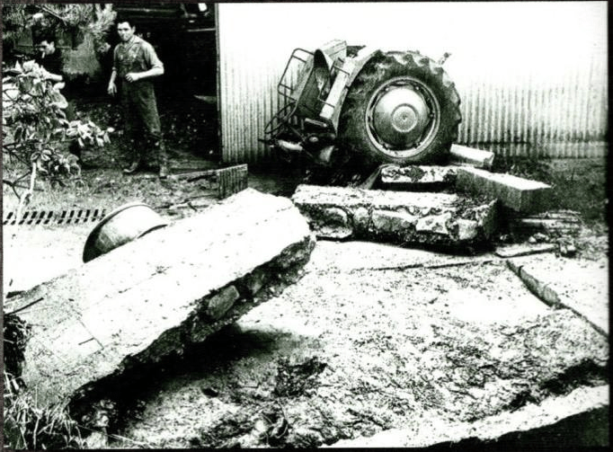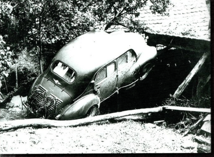 Chez Lehmann Roland et Marie Jo, la4CV (photo page 4) est inutilisable ainsi qu’un motoculteur. 250 litres de vins sont perdus ainsi que le tonneau de 1100 litres (photo page 5). L’ancien pressoir en bois est fracassé contre le plafond du cellier et endommagé.