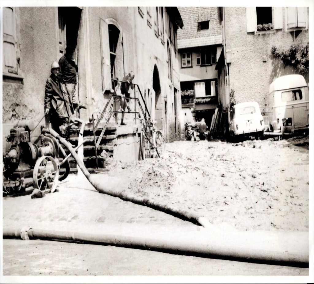 J’avais 14 ans et mon frère Jean Louis 17 ans. Ces deux nuits du 11 et 12 Juin 1966 ne s’oublient pas ! Ma mère avait toujours peur des orages, surtout la nuit et elle éteignait à temps les lumières tout en allumant les chandeliers pour nous éclairer. L’heure était à la prière, d’autant que les éclairs et le tonnerre annonçaient des pluies violentes. Nous étions rassemblés au salon dans l’attente d’une accalmie. Mon père était en alerte avec l’ensemble du Corps des Sapeurs Pompiers dans le village. Très vite, il devenait dangereux de sortir, l’eau atteignant 50 cm de hauteur et descendait sur toute la largeur de la rue principale, emportant tout sur son passage pour s’infiltrer dans les fossés (actuellement rue du Rempart nord). Nos caves sont rapidement inondées et la boue et les détritus se déposent partout. Chez notre voisin, Henri Grob la marque de l’eau restait visible en façade durant des années sur une hauteur de 50 cm.