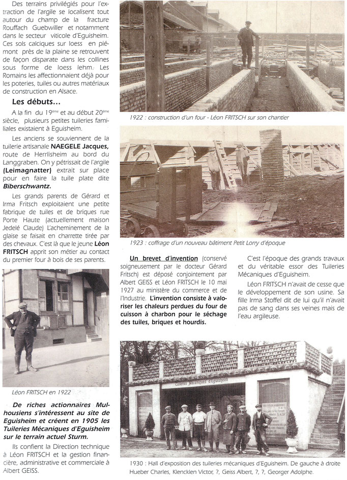 Plusieurs petites tuileries familiales existaient à Eguisheim à la fin du19ème siècle. Des actionnaires Mulhousiens s’intéressent au site et créent en 1905 Les Tuileries Mécaniques d’Eguisheim, dans les alentours de la rue aujourd’hui nommée rue de la Tuilerie. La direction technique est confiée à Léon Fritsch et la direction financière, administrative et commerciale à Albert Geiss. Le 10 mai 1927 tous deux déposent un brevet d’invention consistant à valoriser les chaleurs perdues du four de cuisson à charbon pour le séchage des tuiles, briques et hourdis.