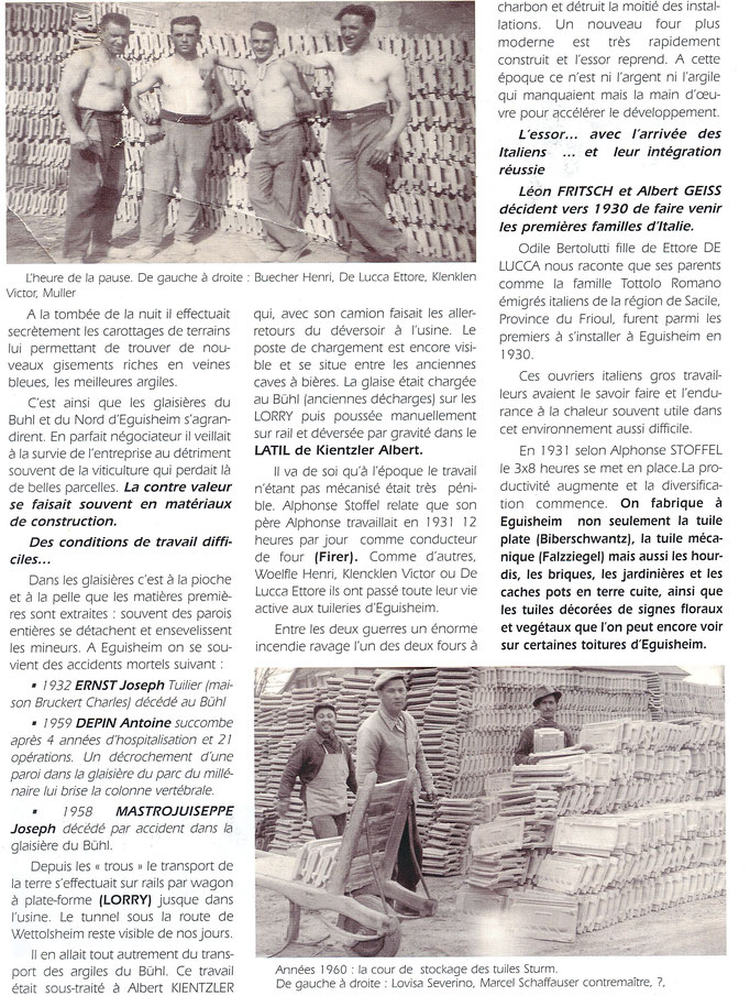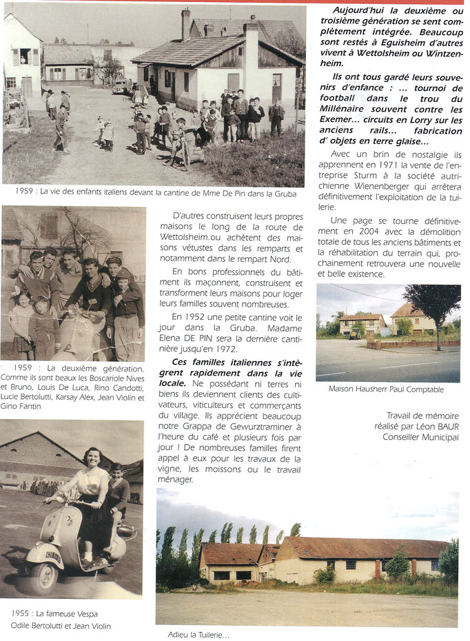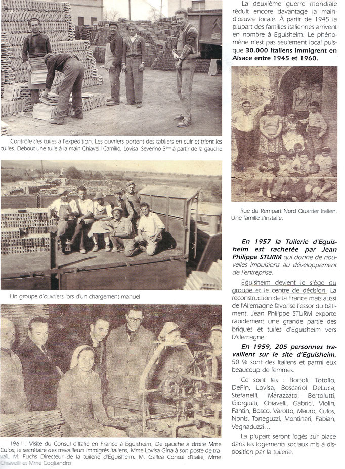 La tuilerie fut rachetée en 1957 par Jean Philippe Sturm qui donne de nouvelles impulsions à l’entreprise. En 1959, 205 personnes travaillent sur le site de la Tuilerie d’Eguisheim dont 50% d’italiens et beaucoup de femmes. Cette nouvelle population s’installe et s’intègre à Eguisheim puis dans les villages alentours.